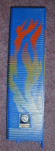 Blue is a nice color for a phonograph, but I thought some flames up the sides of the speakers would look particularly swank. Cutting some painter’s tape into strips, wedges and curves, I taped up the sides of the speakers to create a flame stencil. I didn’t follow any pattern of how the flames should rise up on the speakers; I simply went with my gut and instinct. Originally the plan was to have the flames look similar to those on the side of a hot rod; eventually the flames looked more like those found in a stained glass window of a house of worship.