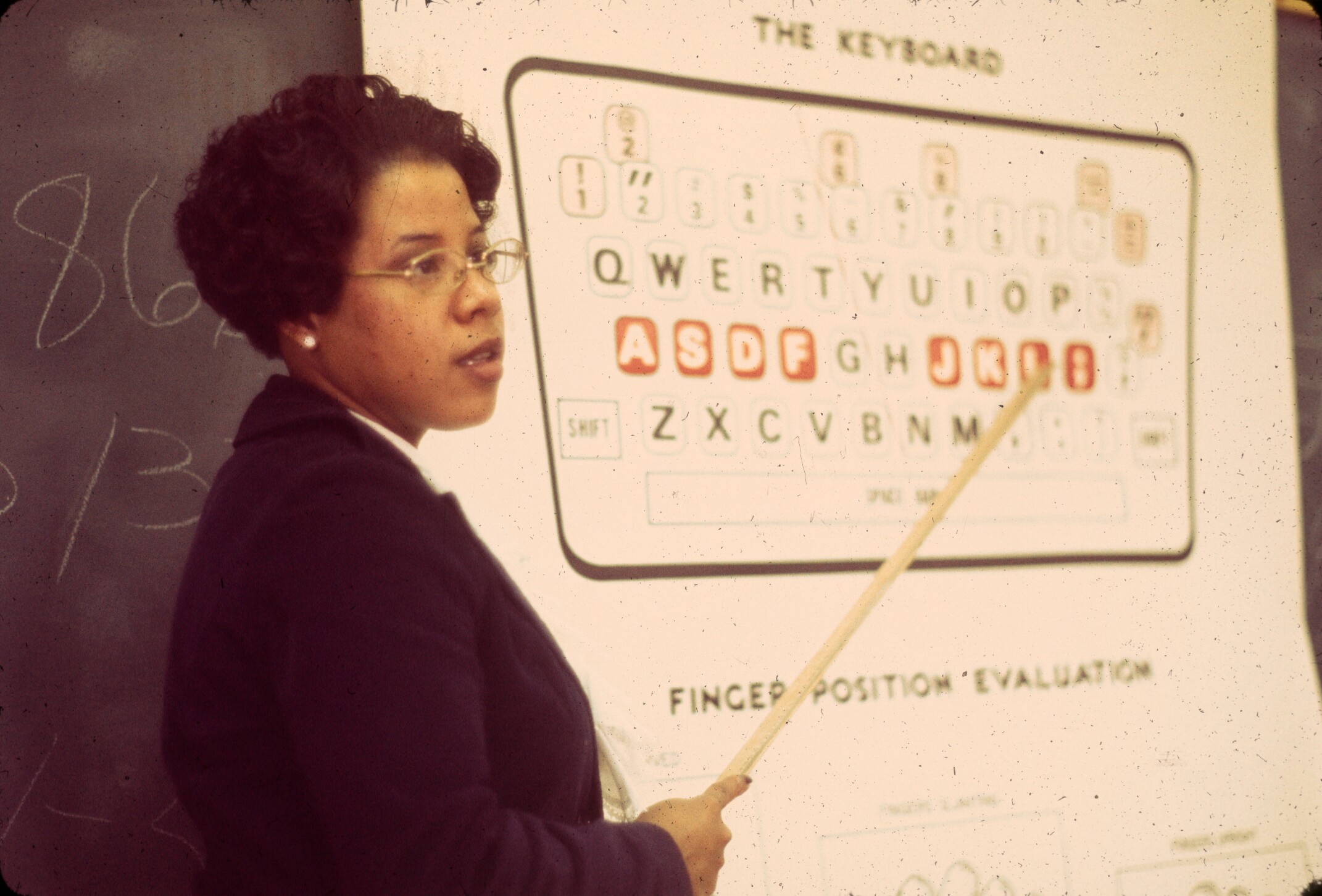 It was a slide of a teacher using a wooden pointer, pointing to a blackboard poster of what looked like a typewriter keyboard. This must have been taken during a home economics introduction to typing class. Of course I remember taking typing class. Actually, I took typing class because I followed Deidre Washington into the typing classroom… mental note… must use brain to make decisions… not other organs …
