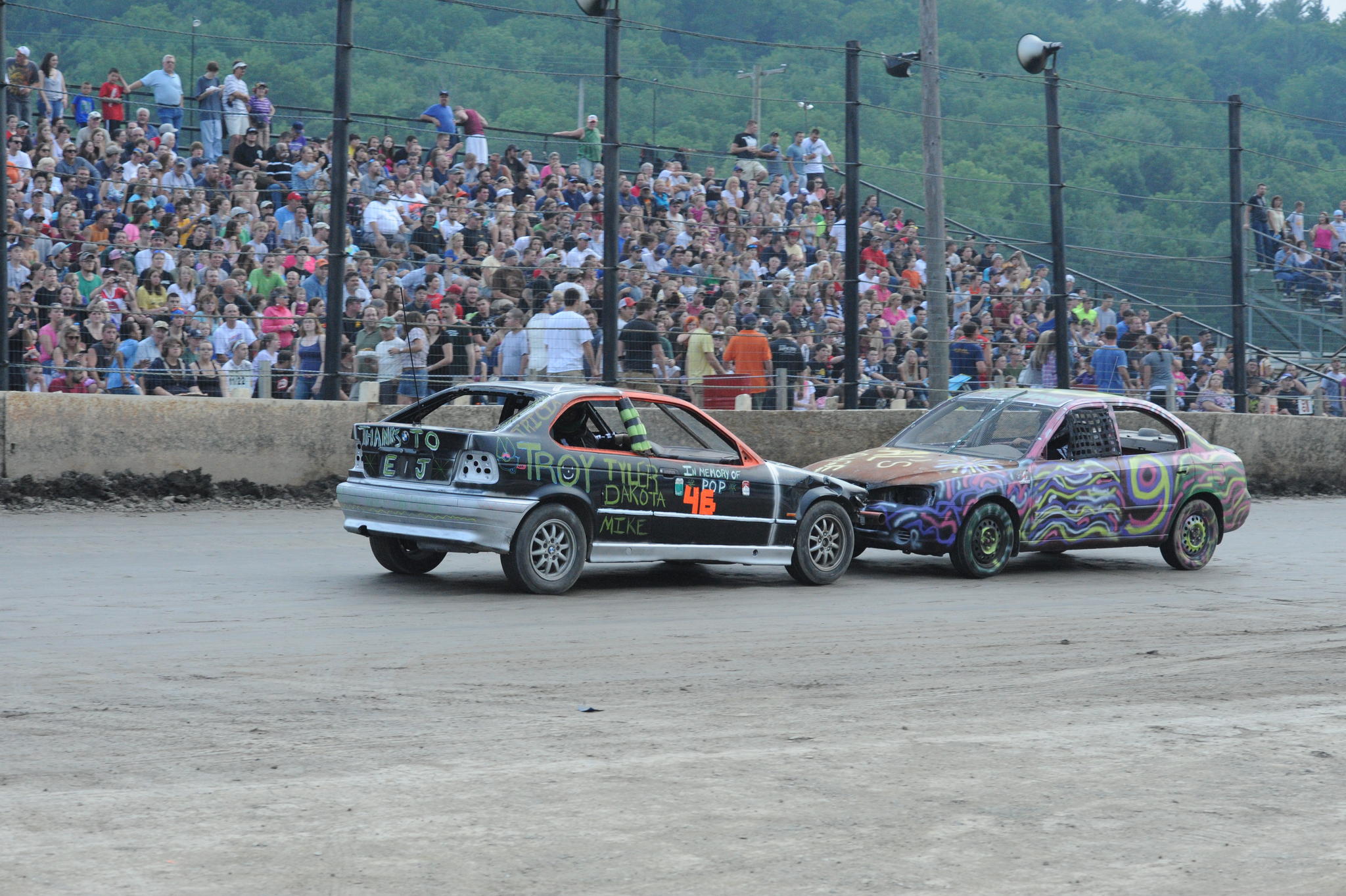 Unlike most Saturday nights at Lebanon Valley Speedway, this was a night of alternative “fun” races. Such as this one, in which two cars are chained together, front bumper to front bumper, and must travel around the track – one car going forward, one going in reverse.