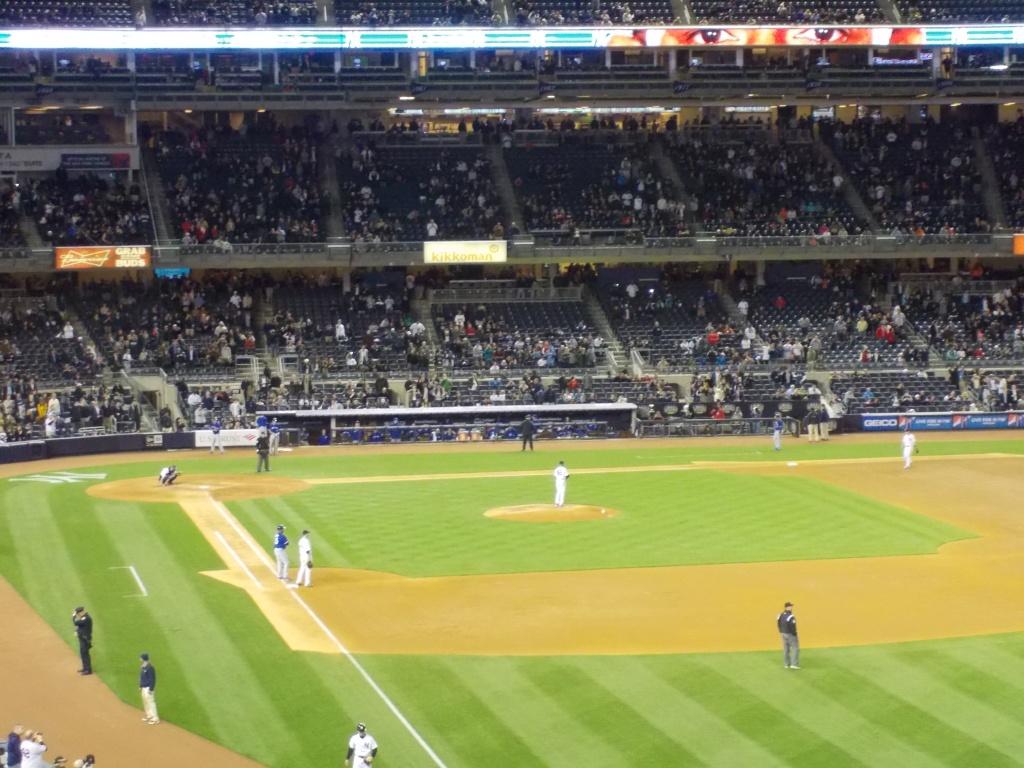 Now I should mention that the Yankees playing against the Toronto Blue Jays would be a decent matchup. That is, if Derek Jeter wasn’t injured, and if Alex Rodriguez wasn’t injured, and Curtis Granderson wasn’t injured… heck, the only star in the lineup was Robinson Cano. And Toronto was also a bit of a walking wounded corps, as Jose Reyes was on the shelf and their starting pitcher was scratched from the game with a sore elbow. And five pitches into the contest, the Yankees catcher got plunked on the hand and had to leave the game. And three innings into the game, Ivan Nova had to get pulled from the match. Walking wounded.