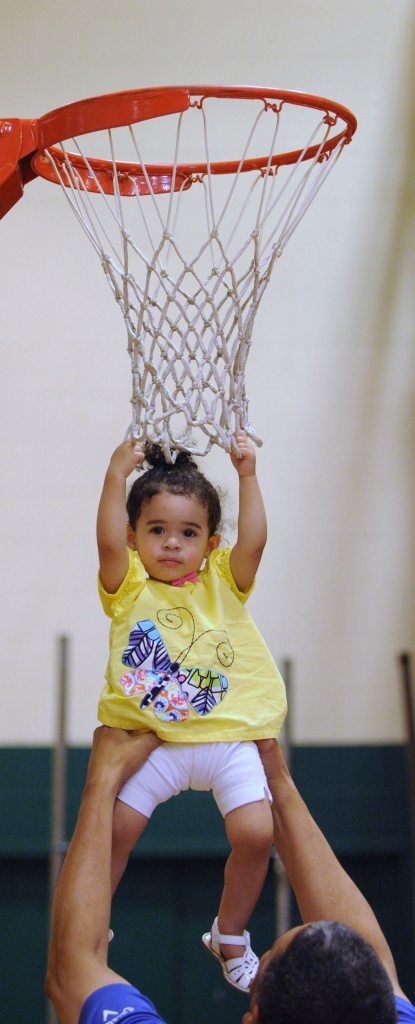 Now I have to share this photo at right with you. During some of the action, I caught, over in the corner of the gym, a glimpse of a man giving his granddaughter a piggy-back ride on his shoulders. Aww, how cute. And he’s lifting her up to one of the unused basketball rims and –