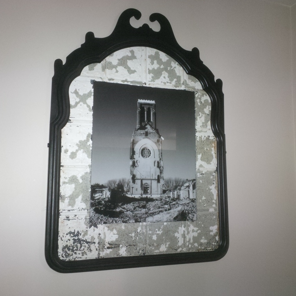 And finally, my third entry for BUILT is Dream Window 8: The Last Sermon.ย This is the shot of the bell tower at St. Patrick’s Church in Watervliet, and features salvaged tin from the church rectory in this artwork.ย The frame came from Silver Fox Salvage, it was once a boudoir mirror frame.ย While this artwork was designated for BUILT weeks ago, it is poignant that the piece is entered in an architectural art show in that this piece was created with the help of Fred Shapiro of Silver Fox Salvage, God rest Fred’s soul.