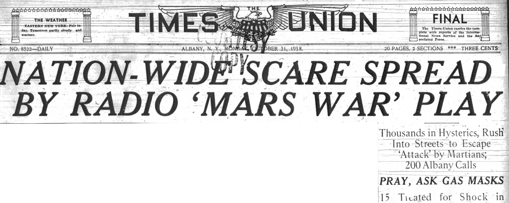 Albanians last night shared the widespread hysteria caused by the radio broadcast describing a mythical invasion of this continent by “Men From Mars.”  Police headquarters received many calls from radio listeners and 200 persons telephoned The Times-Union to obtain further details.  One woman thoroughly convinced that an actual invasion was taking place even placed the transmitter of her telephone to the radio so the reported [sic] could hear “what was going on.”
