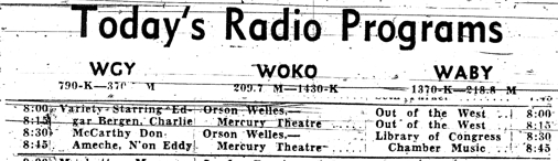 We do know that War of the Worlds aired locally on Albany’s CBS radio affiliate WOKO (1430 AM), while WGY (790 AM), an NBC “Red Network” affiliate at the time, aired the Chase and Sanborn Hour starting at 8:00 p.m.  The third network station in the area, WABY (1370 AM), an NBC “Blue Network” affiliate, aired a couple of musical interludes – a half-hour show called Out of the West, followed by a half-hour of chamber music from the Library of Congress.  Yawn.  Note: The AM frequencies listed are correct for their time period; these stations moved up the dial in 1942 as part of a nationwide radio frequency realignment.