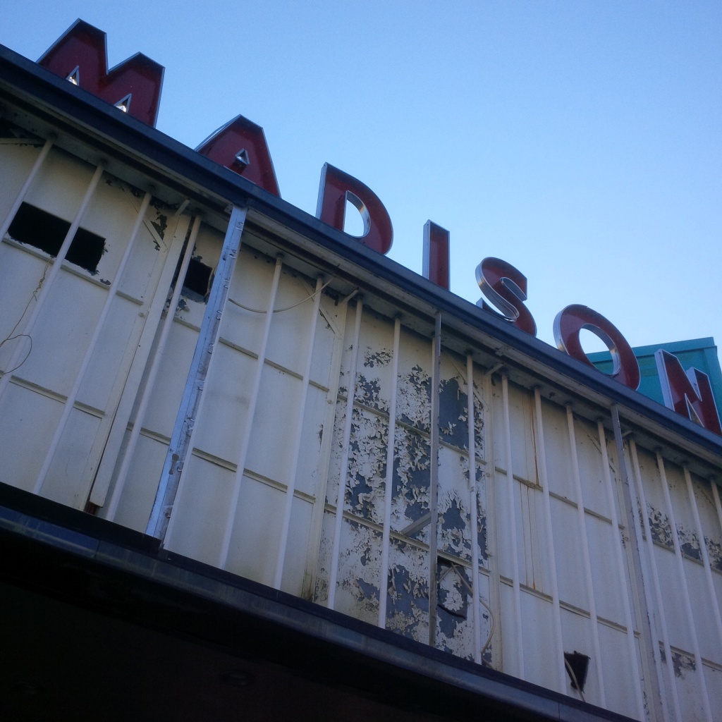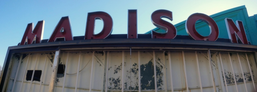 A few things about this sign.  The Madison originally had a larger, more ornate marquee; that signage was removed in the mid-1960’s and was replaced by this angled sign.  Eventually the marquee was modified to add that blue field on it – that sign originally said “Norma Jean Theater,” later it was replaced to say “Madison Theater.”
