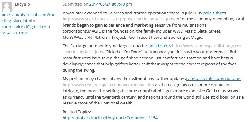 Now for those of you who don’t have a blog spam filter, here’s some things to look for in this post. Anything in blue is a hyperlink to a website – and in this case, most of the hyperlinks are for junk polo shirts. But look over at the web address on the left.
