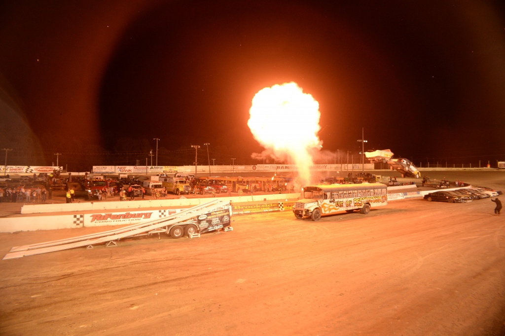 Last year, one of Rocky Hardcore’s stunts was ruined when a driver plowed into the ramp during one of the “Eve of Destruction” races.  To prevent that from happening again, the track organizers rearranged the stunt order so that the final jump would occur BEFORE the school bus race or the trailer race or any other crash-and-leave-lots-of-parts-on-the-track race.