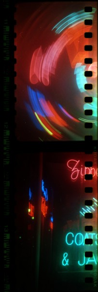 First, I shot the sign with my splitfilm mixture in the AGFA Clipper Special f/6.3. A few static shots at different angles, then I left the shutter open and rotated the camera on its tripod axis. The neon pirouette. I alternated between pirouettes and straight shots.