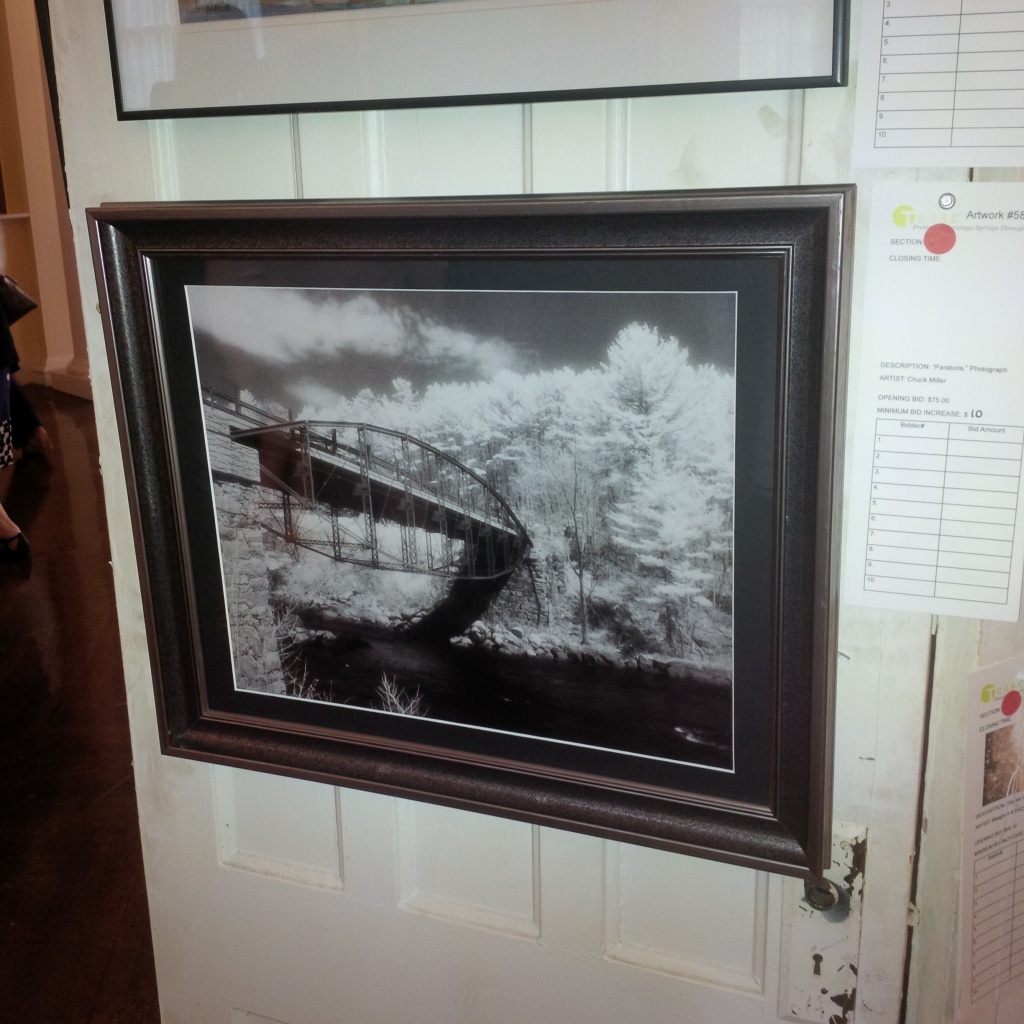 You know, when I dropped the artwork off at the framers, I had a last-minute change-of-mind and oriented the photo into a portrait alignment. I think it looks better this way. Now let’s hope someone bids on it. And then there’s Canopy, my infrared shot of the Hadley Parabolic “Bow” Bridge. That’s somewhere else in the gallery –