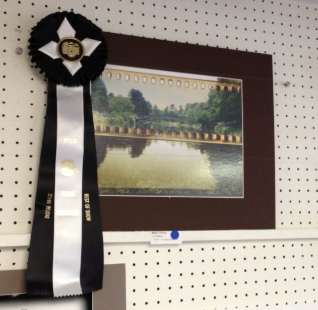 In 2013, I entered the Durham Fair (Connecticut) photo competition, at the recommendation of my friend and fellow photographer Robert Burger. Of the four photos I entered, two pictures took ribbons – The Jumbuck snagged a third-place in its category, while The AGFA Bridge Over Ansco Lake garnered my first-ever Best in Show silk.