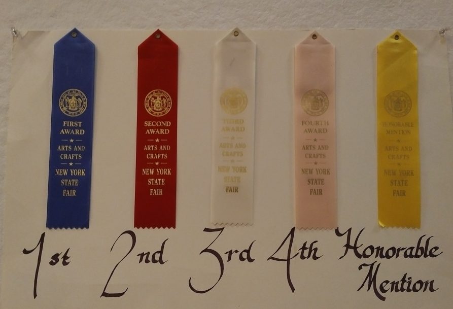 The Arts and Crafts results are on the first floor of the Arts Center, down a corridor past several vendors and sales booths… Nearby is a display sign showing the various ribbons available for entries in this division.