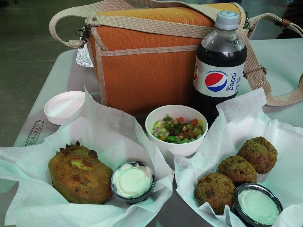 I’m already giddy from the blue ribbon, so I order an Israeli chopped salad (minced vegetables with dressing), a deep-fried cheese blintz with sour cream, and an order of deep-fried matzo balls with ranch dressing.  No, they didn’t have deep-fried Gefilte fish.