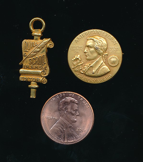 Maybe I could smelt them for their scrap gold value. The back of the Quill and Scroll pin had markings that told me the pin was 1/20 10K gold filled. The American Legion pin was listed as 1/30 10K gold filled. Which means, if I sold these two pins for their scrap metal value, I’d probably get fifteen cents for the pair.