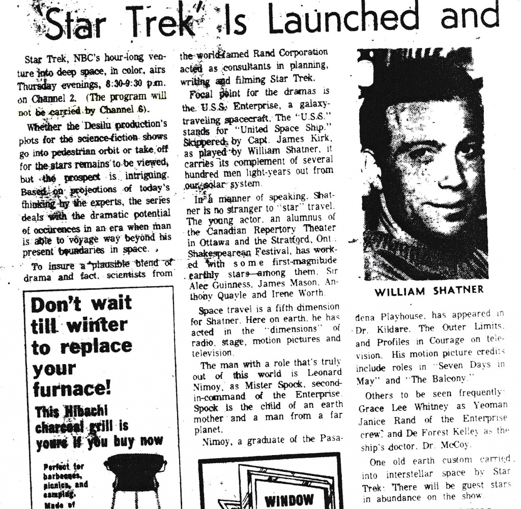 I’m not kidding. A September 1966 TV supplement in the Times Union carried a promotional article about the debut of Star Trek –