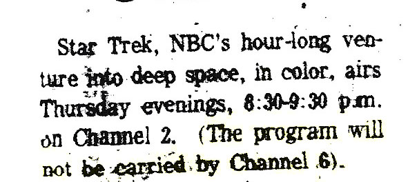 And while most of the United States broadcast Star Trek in its Tuesday night 9:00 pm timeslot, the NBC affiliate in the Albany-Schenectady-Troy area – WRGB – chose a different option. They instead replaced Star Trek with various other programs, including their own local “movie of the week” show.