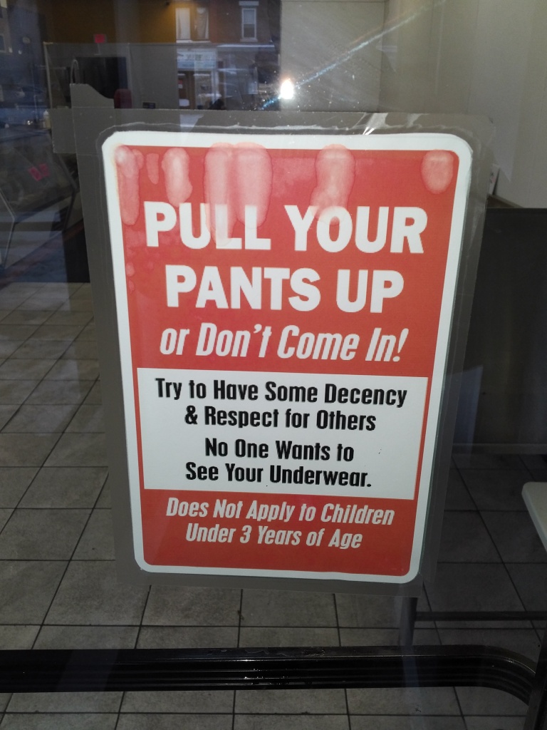 In this day and age – no wait, in this climate where Nor’easters arrive like birthday parties – we still have people who enter businesses with their pants on the ground?