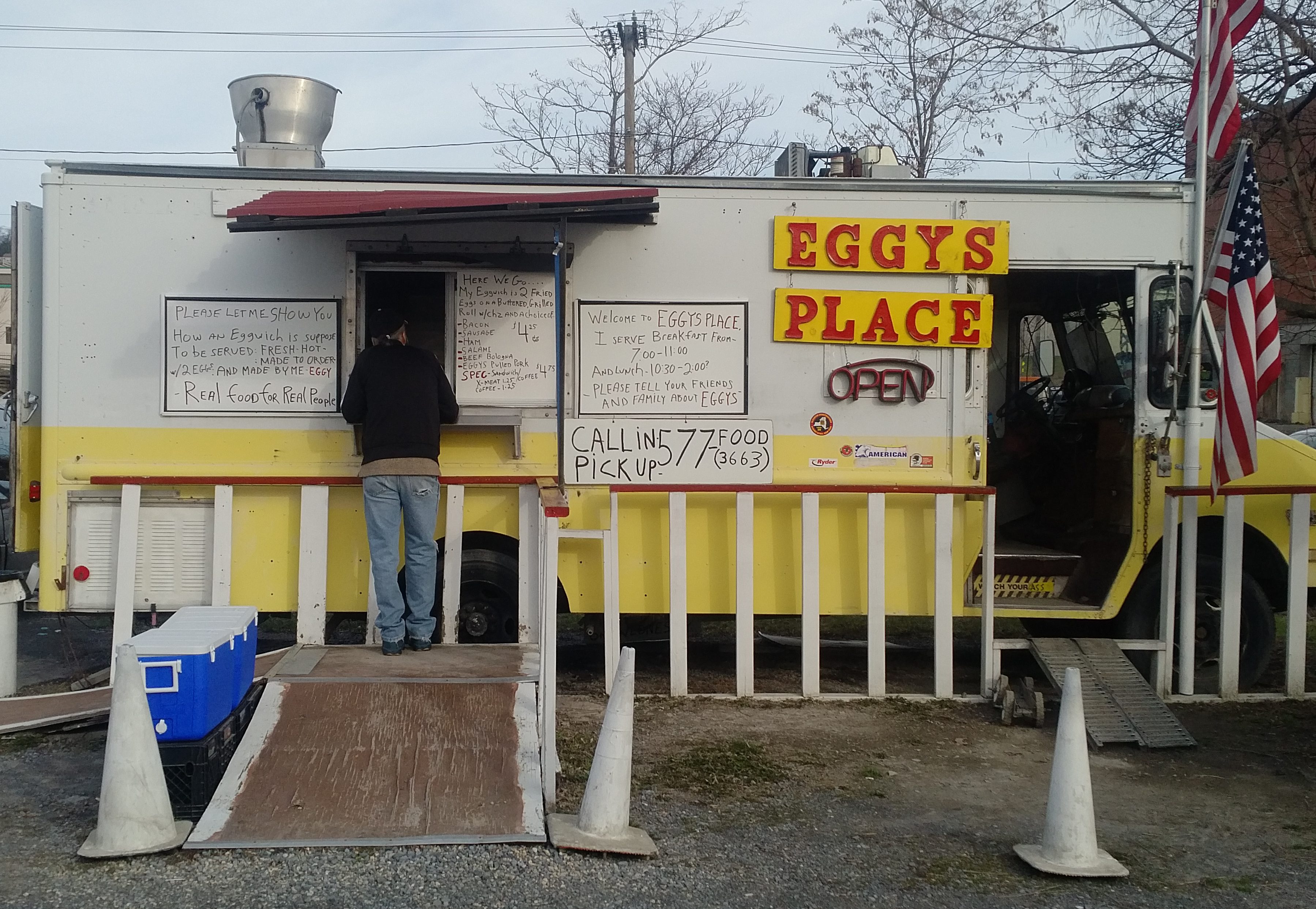Last Monday, the breakfast / lunch food truck known as Eggy’s Place opened for the season. Yep, I ordered an egg sandwich – two fried eggs, cheese and bacon on a Kaiser roll, salt and pepper to taste, and a can of diet cola from the little blue cooler. And while the chef – known as “Eggy” but his real name is something else – makes your morning meal, he whistles and sings and offers words of wisdom.