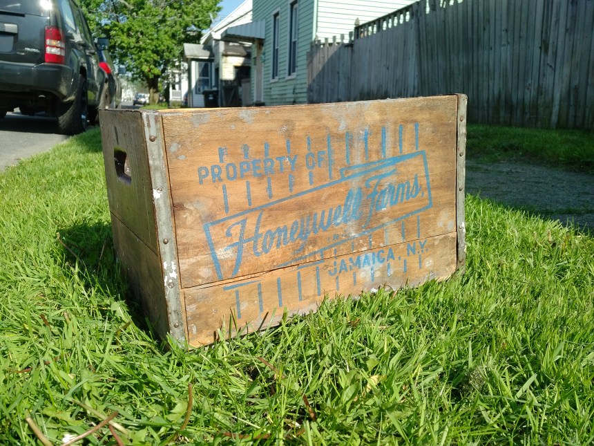 I wanted to create another painted crate artwork, similar to my Norman’s Kill Dairy piece.Β And after searching through eBay, I found a farm crate from Honeywell Farms in Jamaica, N.Y.
