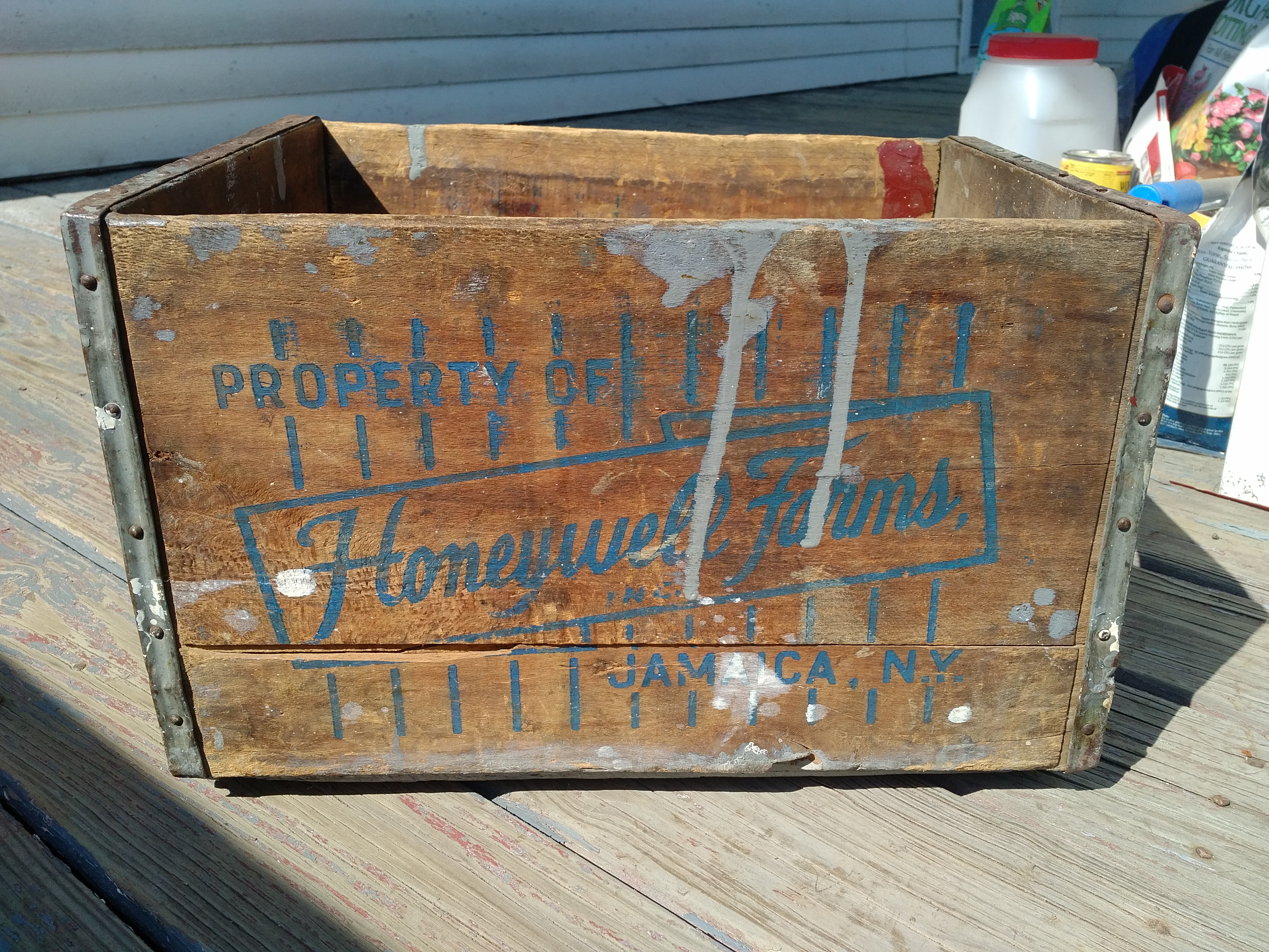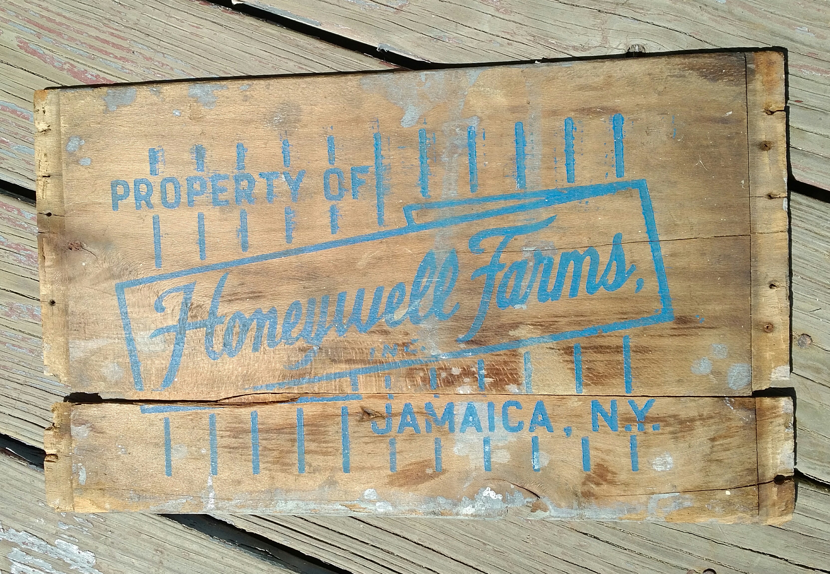 I wanted to create another painted crate artwork, similar to my Norman’s Kill Dairy piece.Β And after searching through eBay, I found a farm crate from Honeywell Farms in Jamaica, N.Y.