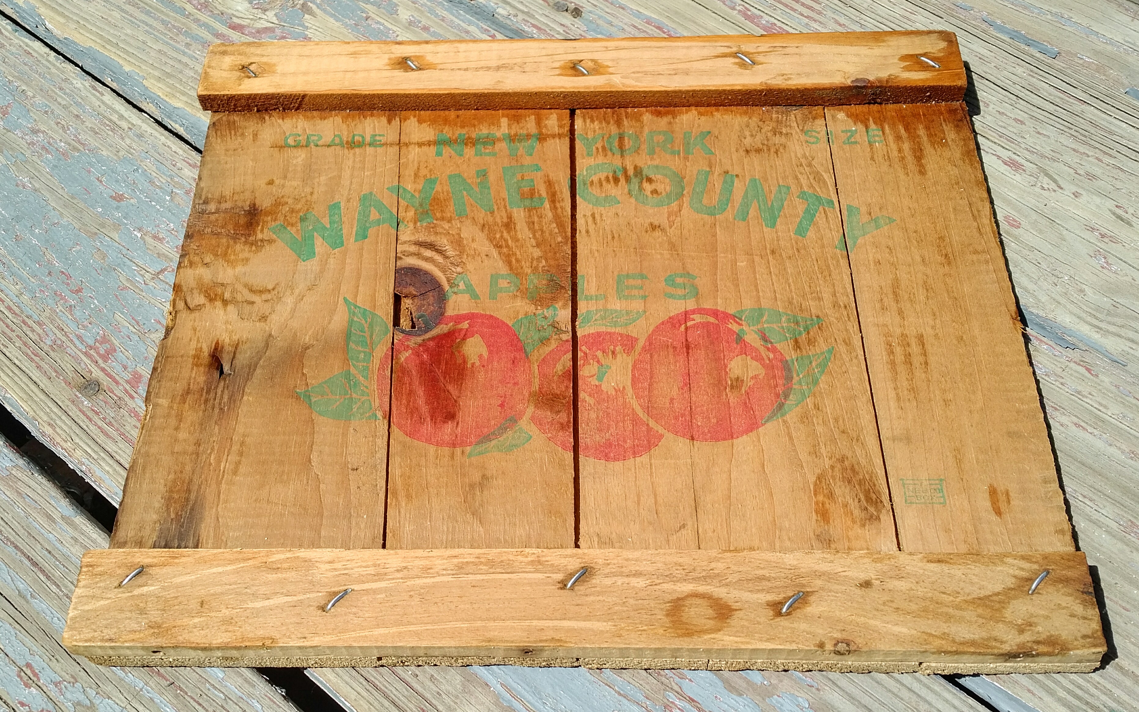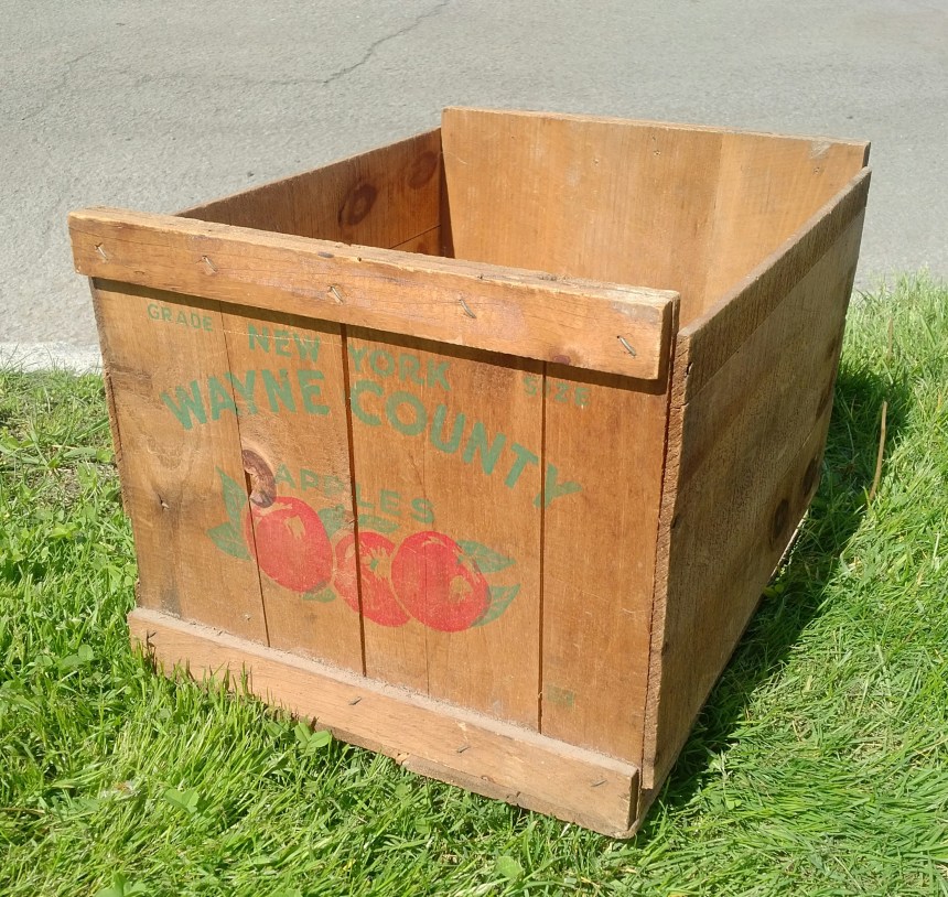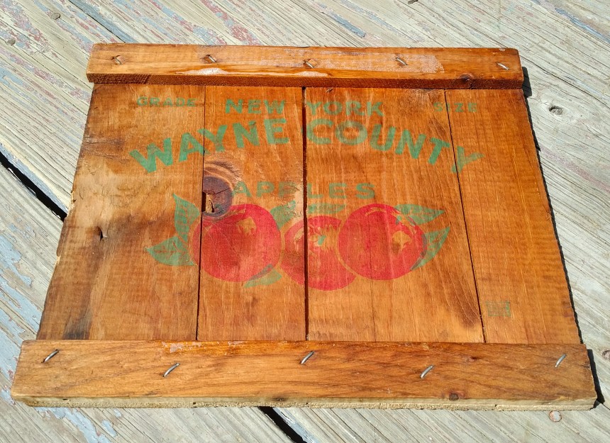 That’s a cool logo on the front of the crate – NEW YORK WAYNE COUNTY APPLES on the front, along with a few painted apples to effect.