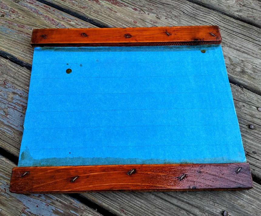 Now for the clear shellac. Again, painter’s tape, this time on the horizontal boards. And a few generous coats of shellac to coat and preserve the brand … and …