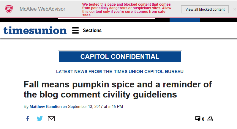 That’s nothing. Here’s a line from the Times-Union story after polls closed in the Rensselaer County Executive race: “Reports of recordings of arguments between McLaughlin and a female aide were believed to have played a strong role in the assemblyman’s defeat.” I don’t think defeat means what they think it means. That’s why the Times-Union is #FakeNews.