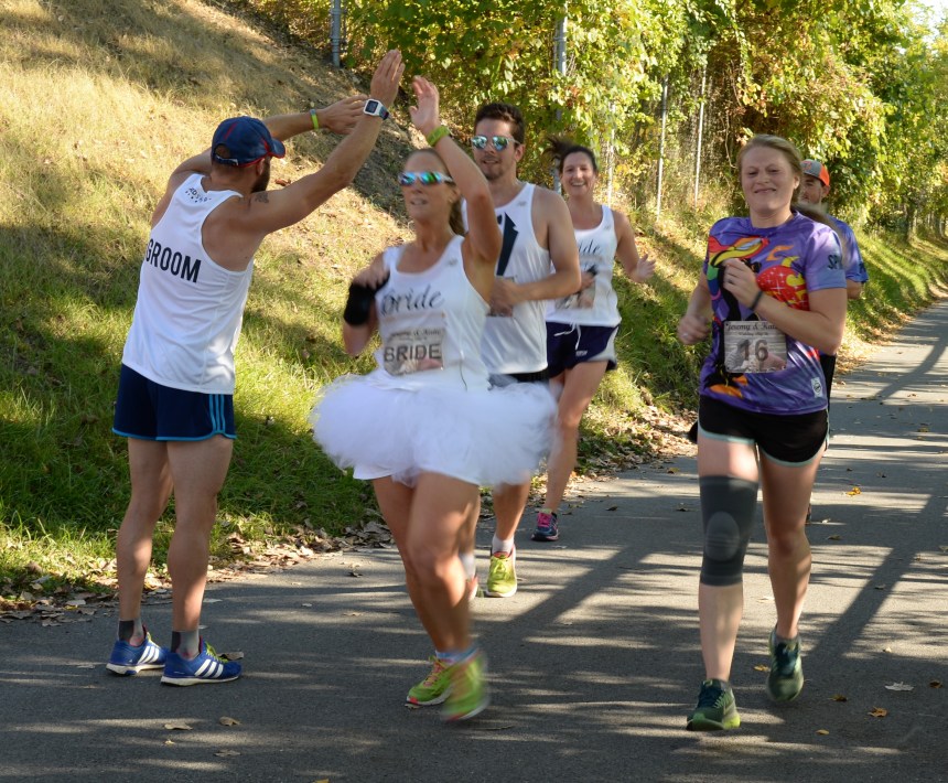 So J-Mac and Katie, along with several members of their wedding party, participated in a little 5K “fun run” along the trails of Albany’s Corning Preserve.  And they even had bib numbers and an electronic timing strip for the race.