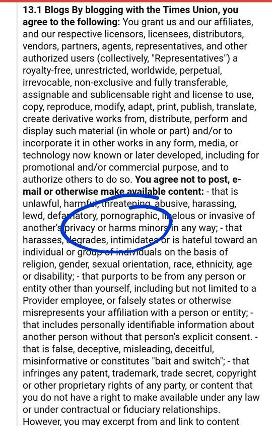 The Times Union claims to not have contact information for the bloggers, even though they were able to contact the bloggers through e-mail to let them know that they were suspended. Shameful. Two phone calls could have avoided this – one call to each blogger. Or an e-mail to each person addressing adjustments necessary to keep the TU insulated from any problems. You might not be able to edit someone’s text, but you certainly could have said, “Hey, I’m uncomfortable with the word ‘penis’ in your blog, can we please find another word or use some sort of grawflix symbols instead?”