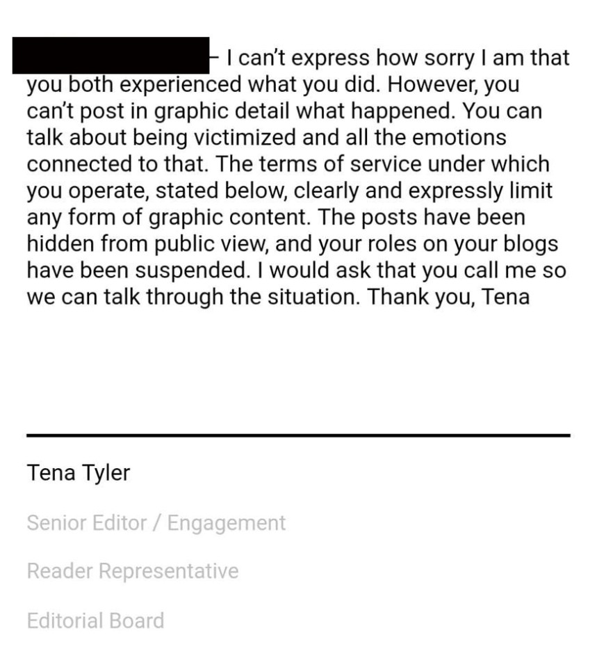 To do what you did, even if you hid your actions under some nebulous Terms of Service clause, was the equivalent of telling these two wonderful women that what they said in their blogs was too offensive for public view. That their courage meant nothing. That whatever they said was marginalized one more time.