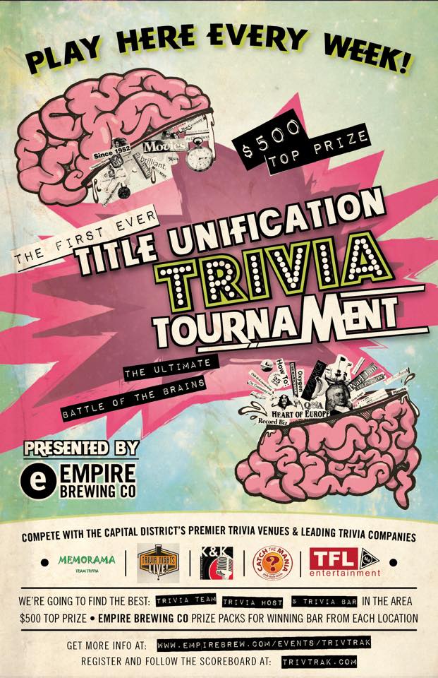 This is going to be awesome. Several of the Capital District’s premier trivia companies, including Trivia Nights Live, Memorama and Catch the Mania, will participate in an inter-promotional trivia tournament. And there’s a $500 top prize for the top trivia team, as well as prize packs from sponsor Empire Brewing.