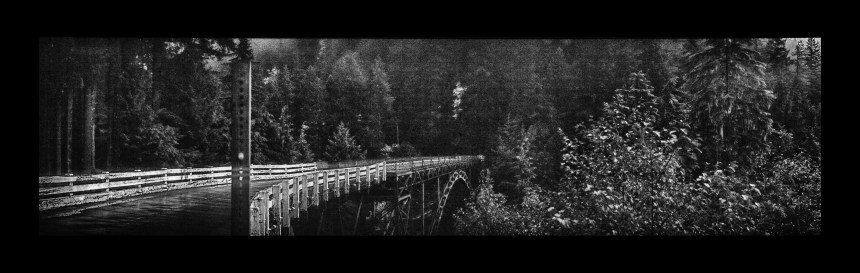 Raskolnikov spent some time at the Carbon River near Mt. Rainier, and i photographed some deep shots off a one-lane bridge that spanned the river. I used some Japanese Ektachrome Dyna 100 as a test film, and eventually flipped the film into a black and white construct. And I got this.