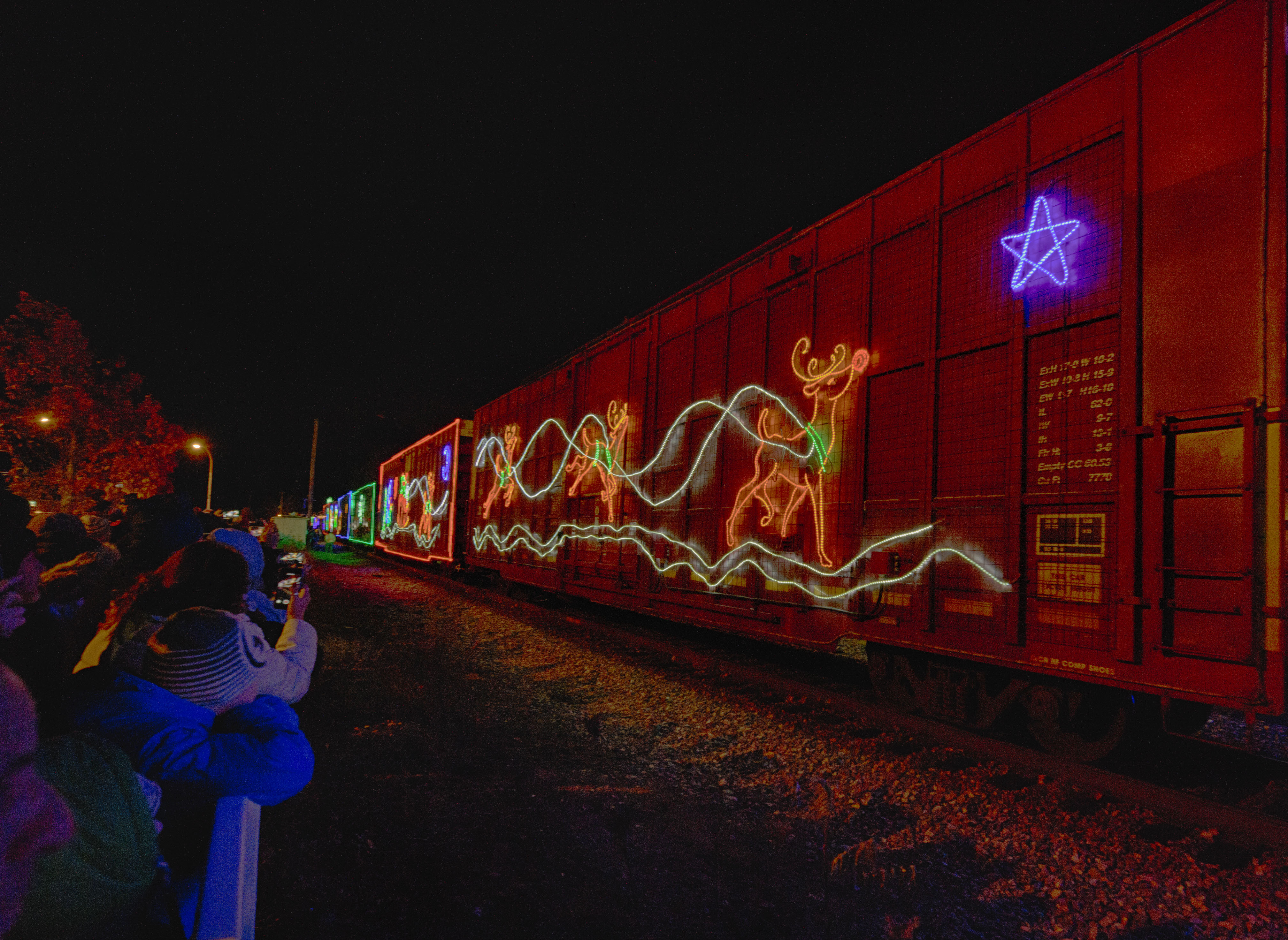 Then came some shots of Rudolph and Santa, snowmen and snowflakes.  And the Irix camera lens not only captured the lighted boxcars … it also captured the people photographing the boxcars.