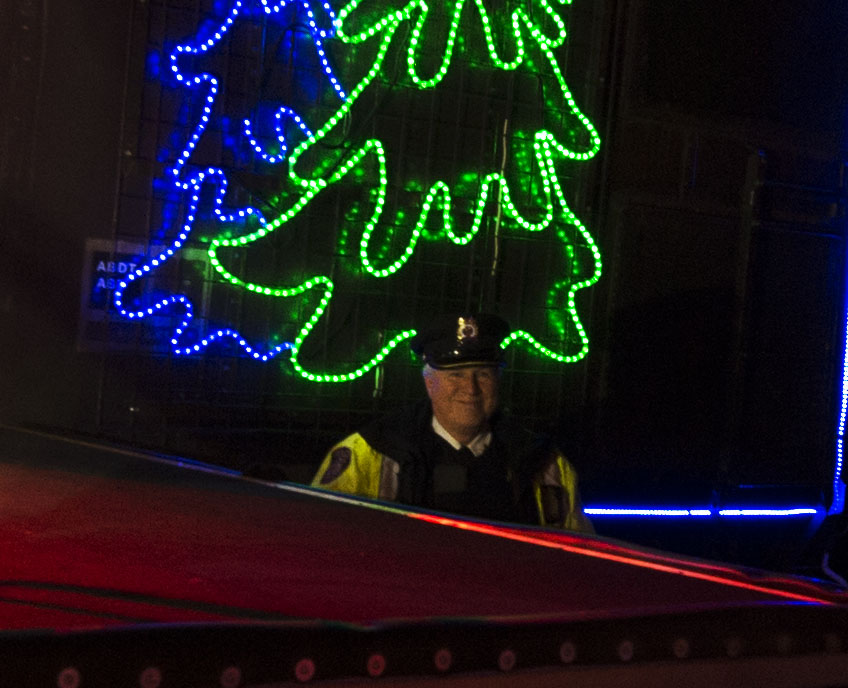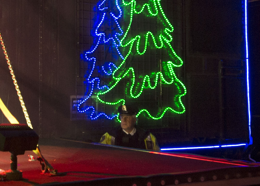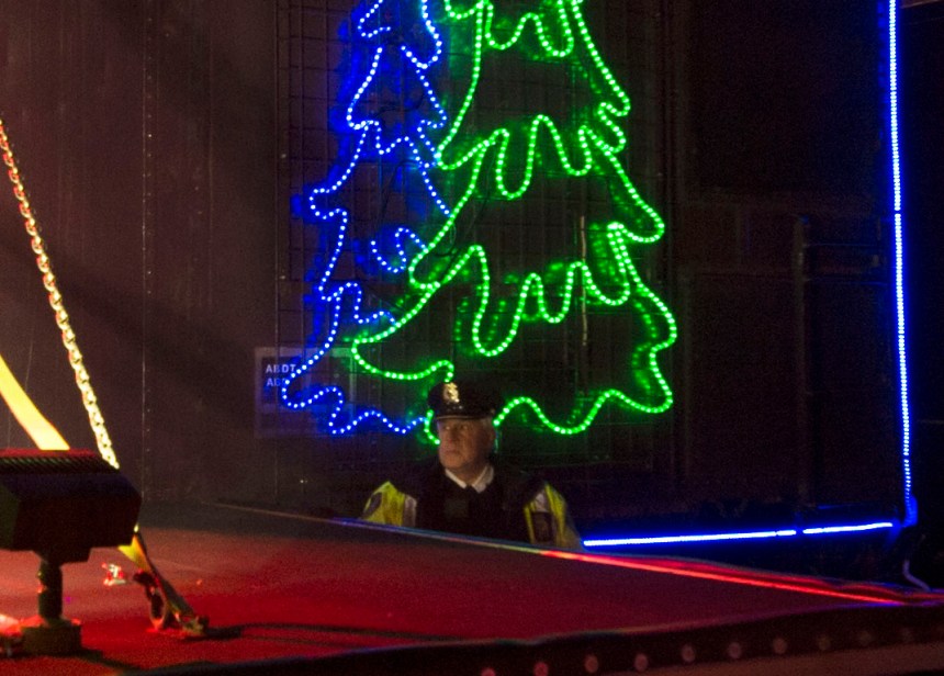 Hey wait a second.  Over by the corner of the stage, there’s a CP police officer.  And he’s not smiling.