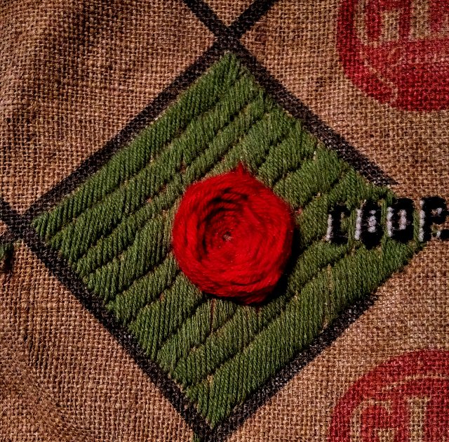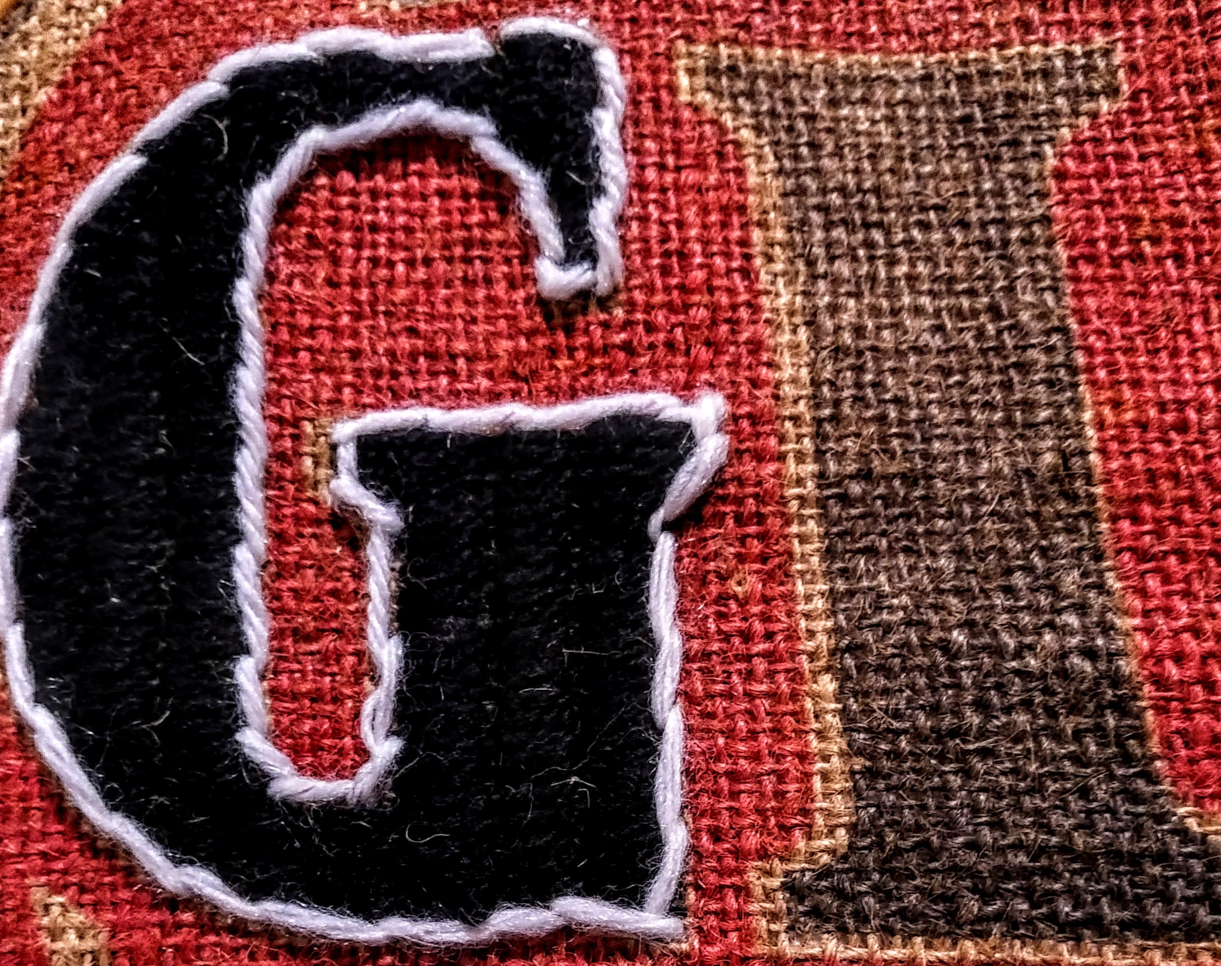 I started with a “satin stitch” along the “G” in the center GLF logo.  And with the stabilizing fabric backing the burlap, the finished stitching was, for me, more constant and even.