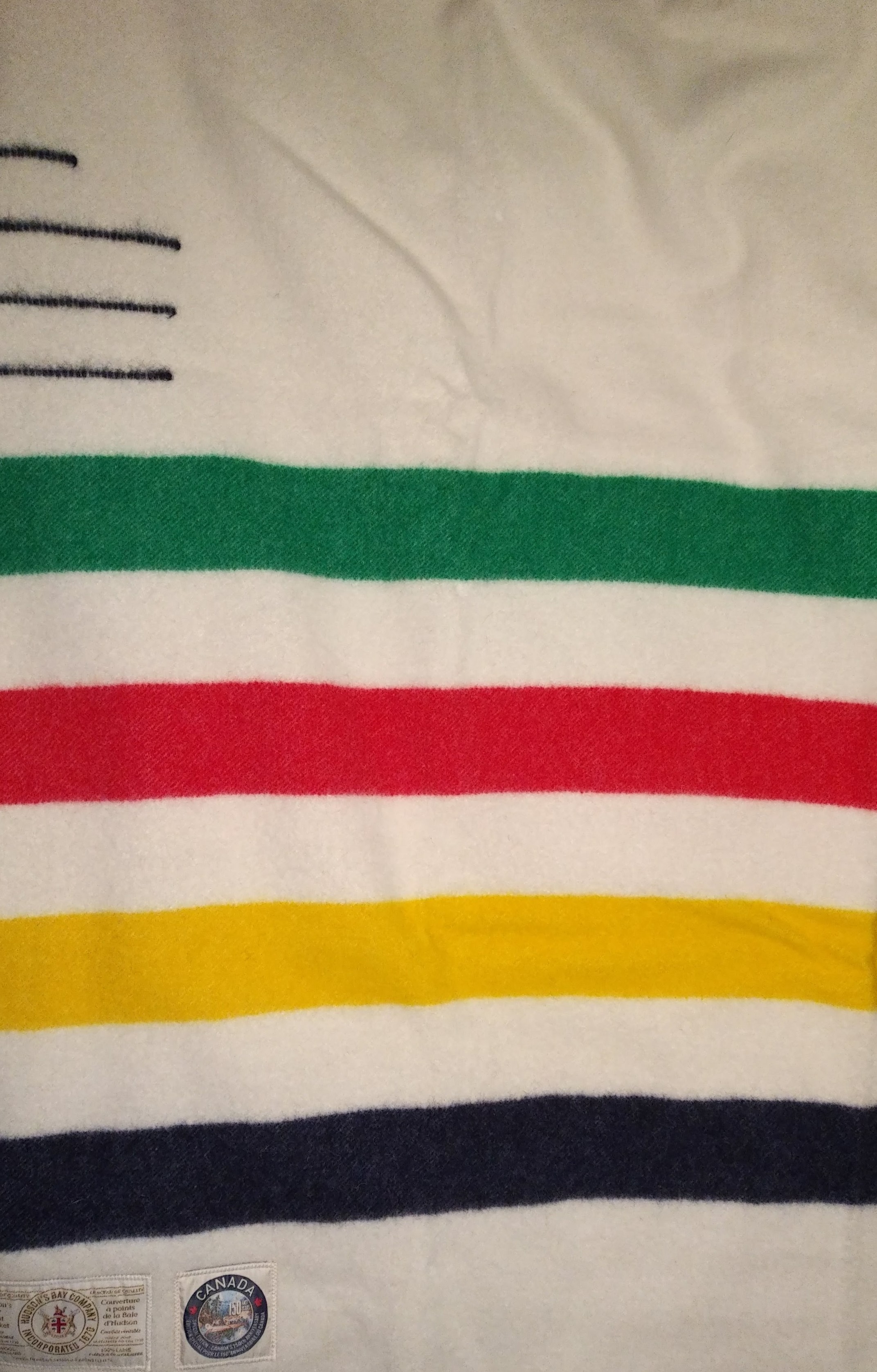 “Point Blankets” are woolen bedcovers that were used in early trade by the Hudson’s Bay Company in Canada. They’re called “point blankets” because they contain little lines, or “points,” that allow visible confirmation of the size of a folded blanket. For example, my point blanket has three and a half points, designating it as a twin-size blanket – just the right size for me.