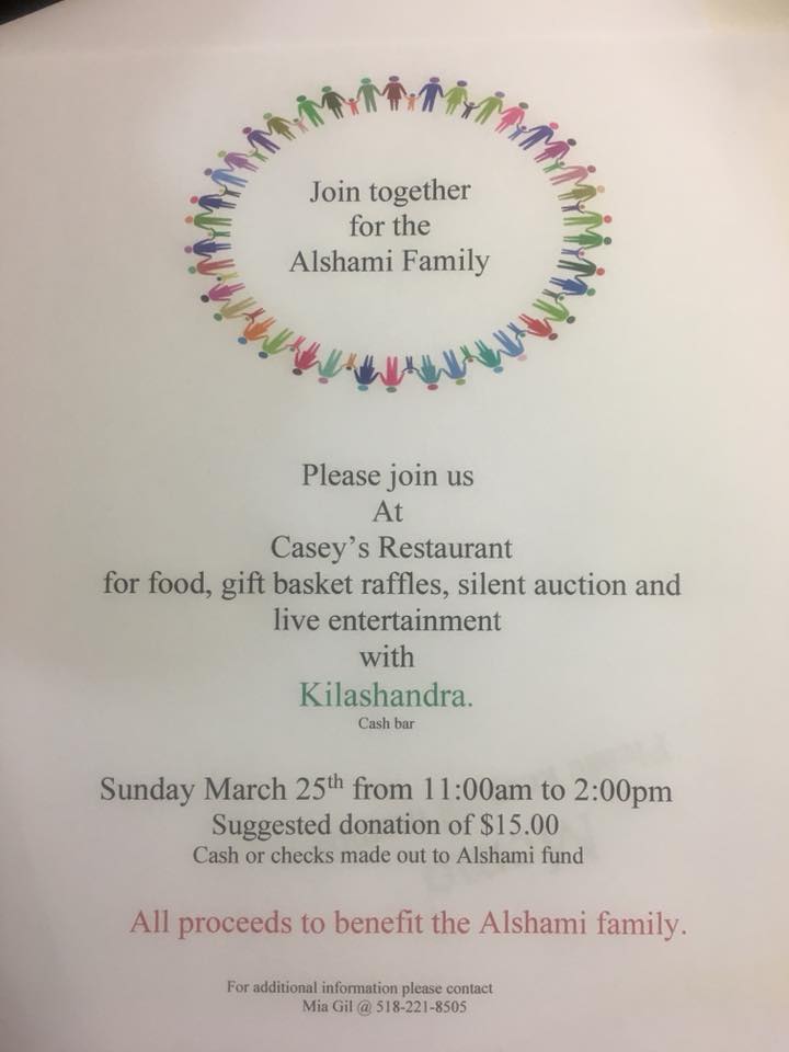 The fundraiser will take place on Sundasy, March 25th from 11am to 2pm at Casey’s Restaurant, 77 Washington Avenue in Rensselaer.ย Suggested donations are $15 at the door.ย Kilashandra will perform at the event, and all proceeds will help benefit the Alshami family.