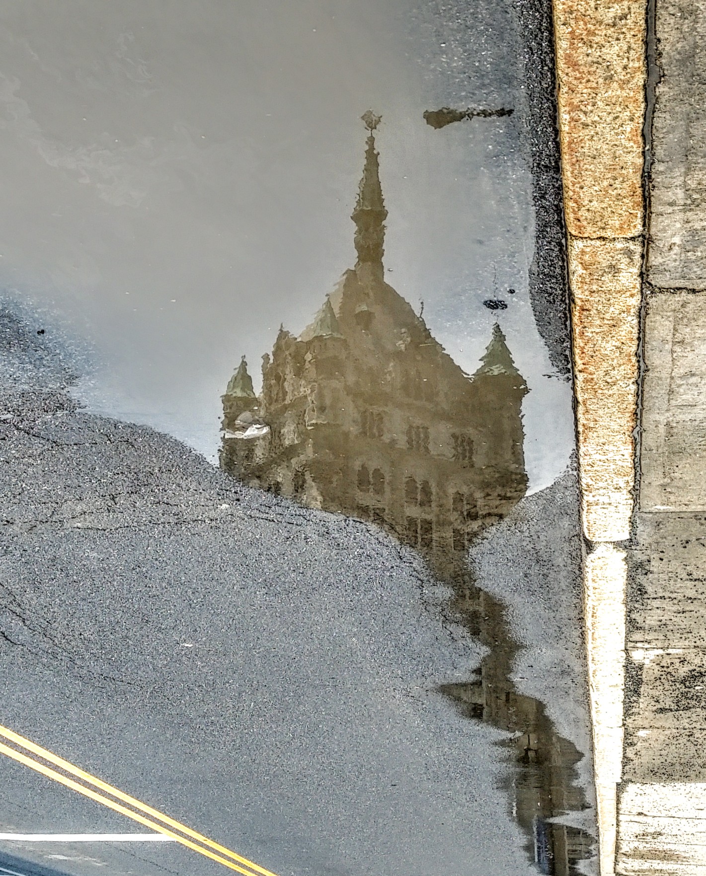 Ooh. And that trickle of puddle down to the storm drain … you can see the facade of the SUNY building all the way through it, almost like the peek-a-boo outfit of an elegant lady’s exotic dress.