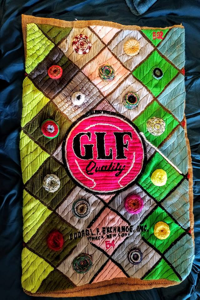 As you can see from the picture at right, I am almost finished with my GLF Quality burlap sack stitching project. What was originally an old burlap gunny sack was rethreaded with yards and yards of yarn, resewn and restitched into a swank embroidery project.