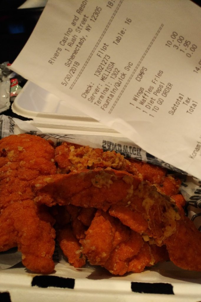 I stopped at Flipt and ordered some chicken wings, along with some waffle fries and a diet cola. Paid for everything. My order was placed in two clamshell canisters, and I walked over to the Van Slyck casino bar for a night of trivia.