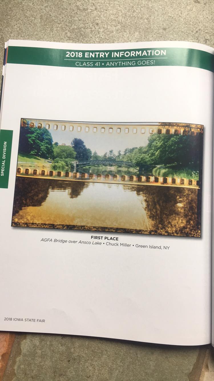Holy splitfilm, Batman … The AGFA Bridge Over Ansco Lake, my experiment in shooting two films at once through a vintage camera – the photo that claimed “Best in Show” at the Durham Fair, as well as the only picture that I know of that won silks at both Altamont and Syracuse … just picked up another First Place Ribbon!