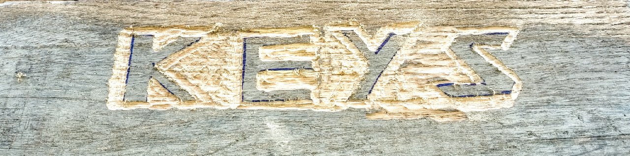 First, I tried to build a key ring holder. I penciled the word “KEYS” on a block of wood. Then, after donning protective goggles and a face mask – trust me, you have no idea what kind of chemicals and gunk are in 50-year-old crate wood – I used a small Dremel carbide burr to trim around the letters. After they were sufficiently trimmed, I used a different carbide burr to sand away the wood and leave the word “KEYS” in a raised bas-relief.