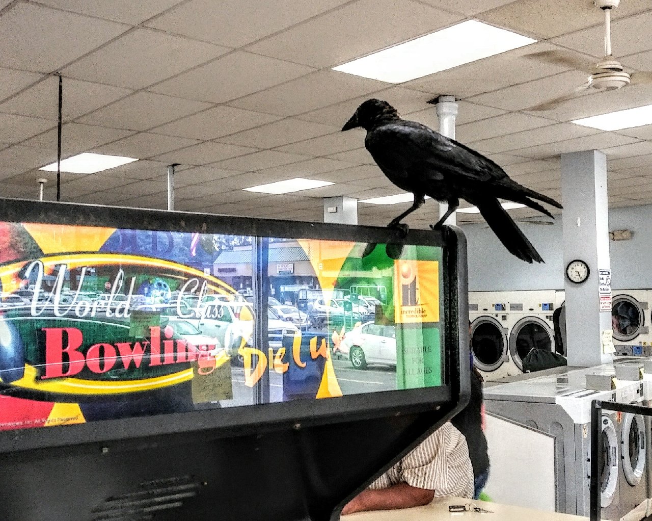 Yep, a crow somehow flew INTO the laundromat and couldn’t get out. Patrons were scrambling around to get away from the bird, little kids were laughing when the bird dropped a dropping on the floor (“Mommy, the bird made a doody…”), while the owner was looking for anything to use as a weapon to hit the bird.
