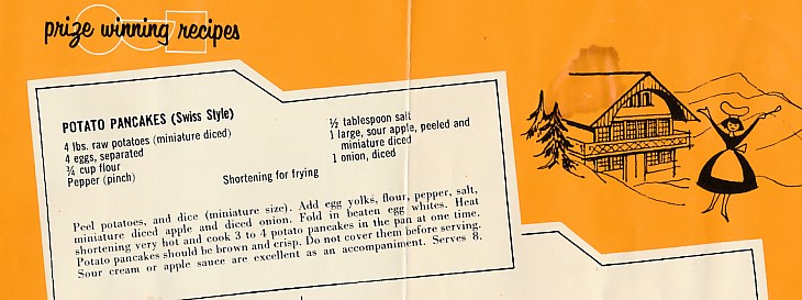 The Veg-O-Matic came with a booklet for use and maintenance, along with two recipes – a recipe for Waldorf salad, and a recipe for potato pancakes (Swiss style).ย I don’t know if “Swiss style” means my food will have holes in it, if it will yodel when I serve it, or if it will have a cuckoo pop out at the top of the hour … I kid, I kid…