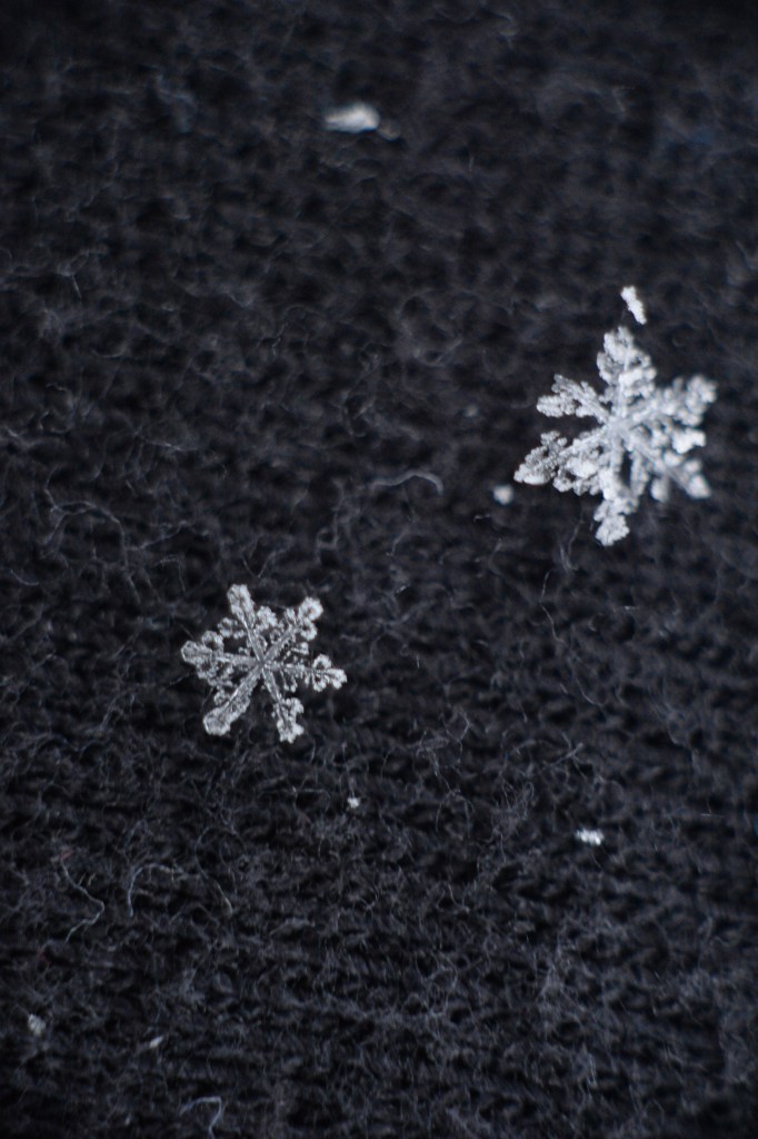 Last week, I captured snowflakes from an early morning snowstorm. The snowflakes landed on a cold black T-shirt and on a dark blue bath towel. I used a macro lens and a ring flash to capture the sparkly little guys in all their hexagonic glory.