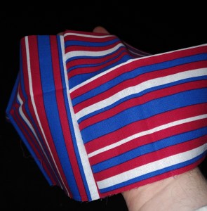 Okay … now all I want to do is make one attempt at stitching.ย I had some scrap fabric – some colored, striped cotton panels – and decided, for a test, to stitch two scrap pieces together.ย And to prove that I actually DID stitch this together, I turned one of the stripes at a 90ยฐ angle.