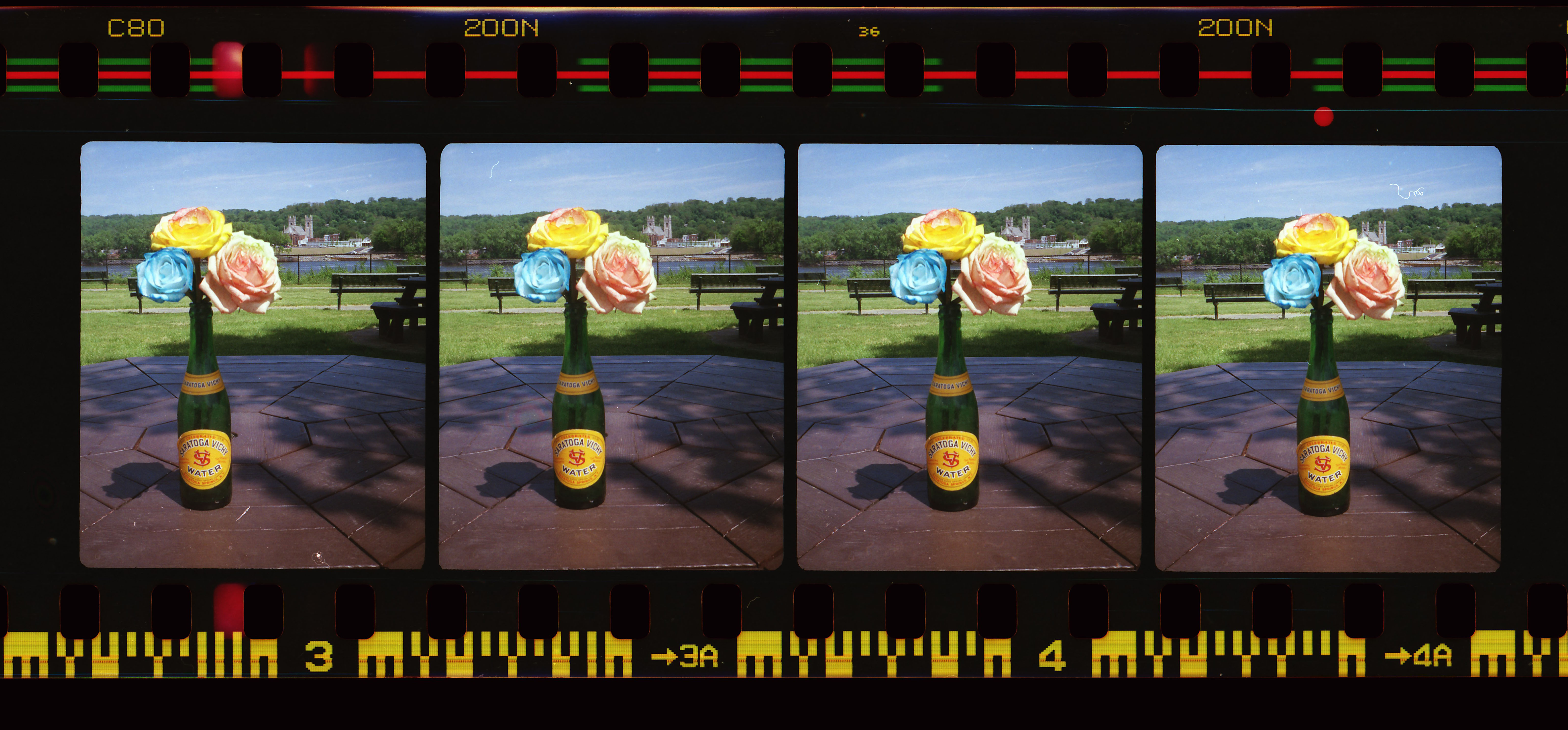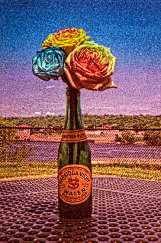 Last week, I showed off some lenticular-like photos – the subject was three home-colored roses that were arranged in a bottle of Saratoga Vichy mineral water. Looked sorta like this.