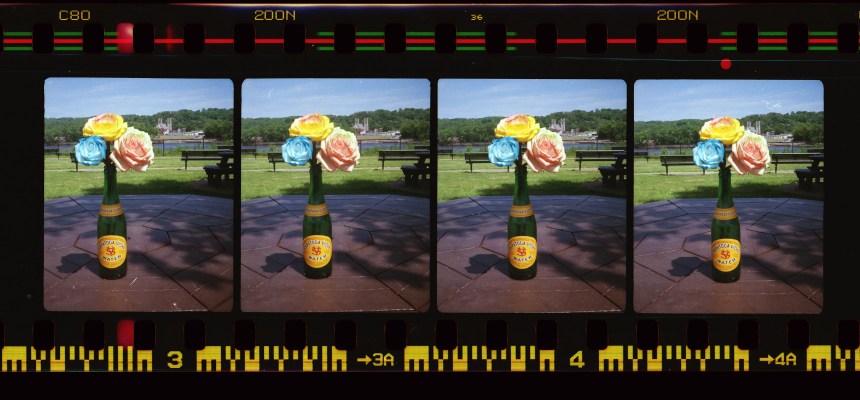 Thankfully, though … I did take some photos with my NIMSLO on that sunny Monday, and I hope they turned out well. I placed the bottle and flowers on a metal table, and photographed the subject with my NIMSLO camera, using colorful AGFA Vista 200 film as my shooting compound.
