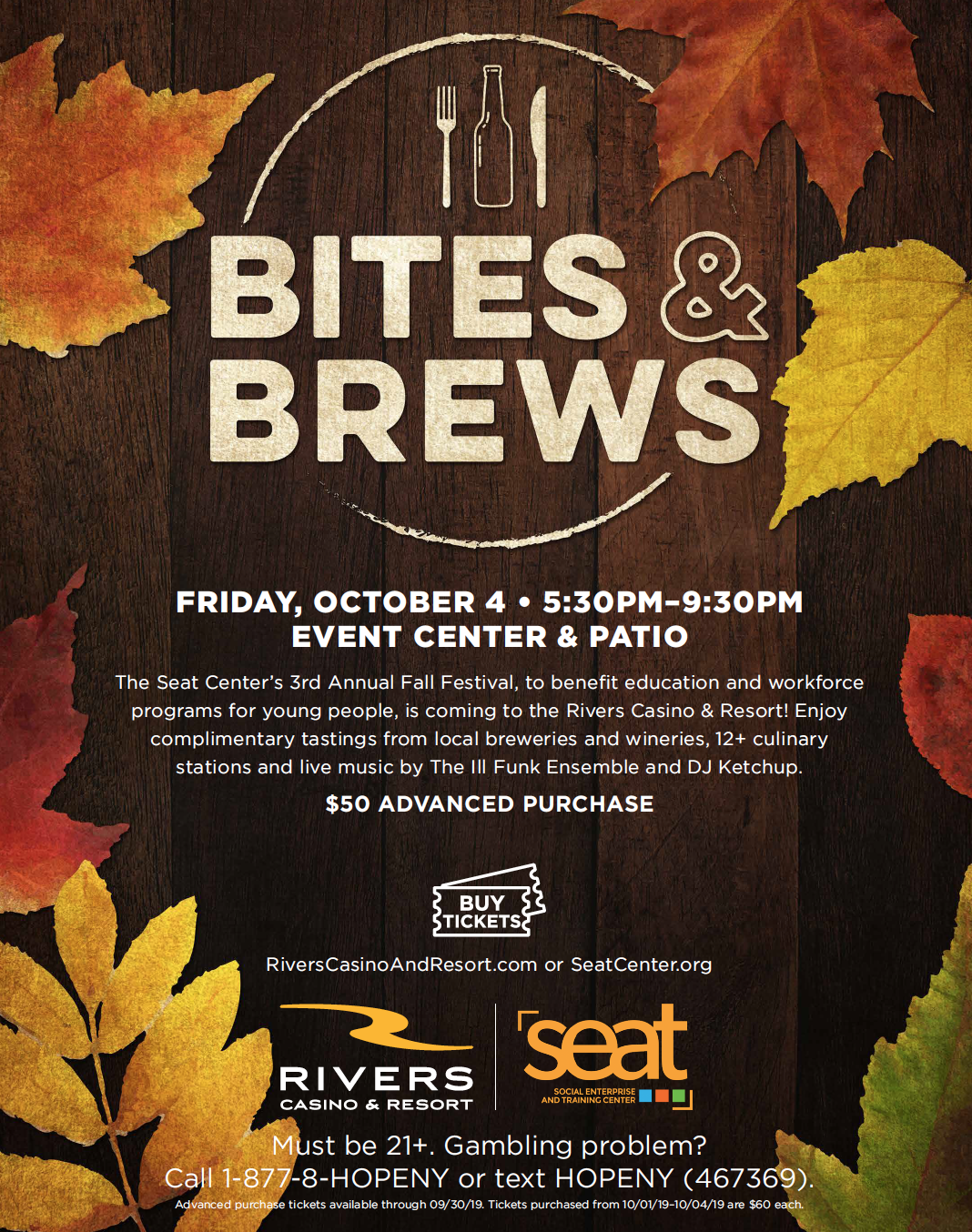 The SEAT Center’s “3rd Annual Bites & Brews” is on Friday, October 4 at Rivers Casino and Resort. This is an amazing event and you do NOT want to miss it. And your help and support will go a long way to helping the community become a much better place. I mean it.
