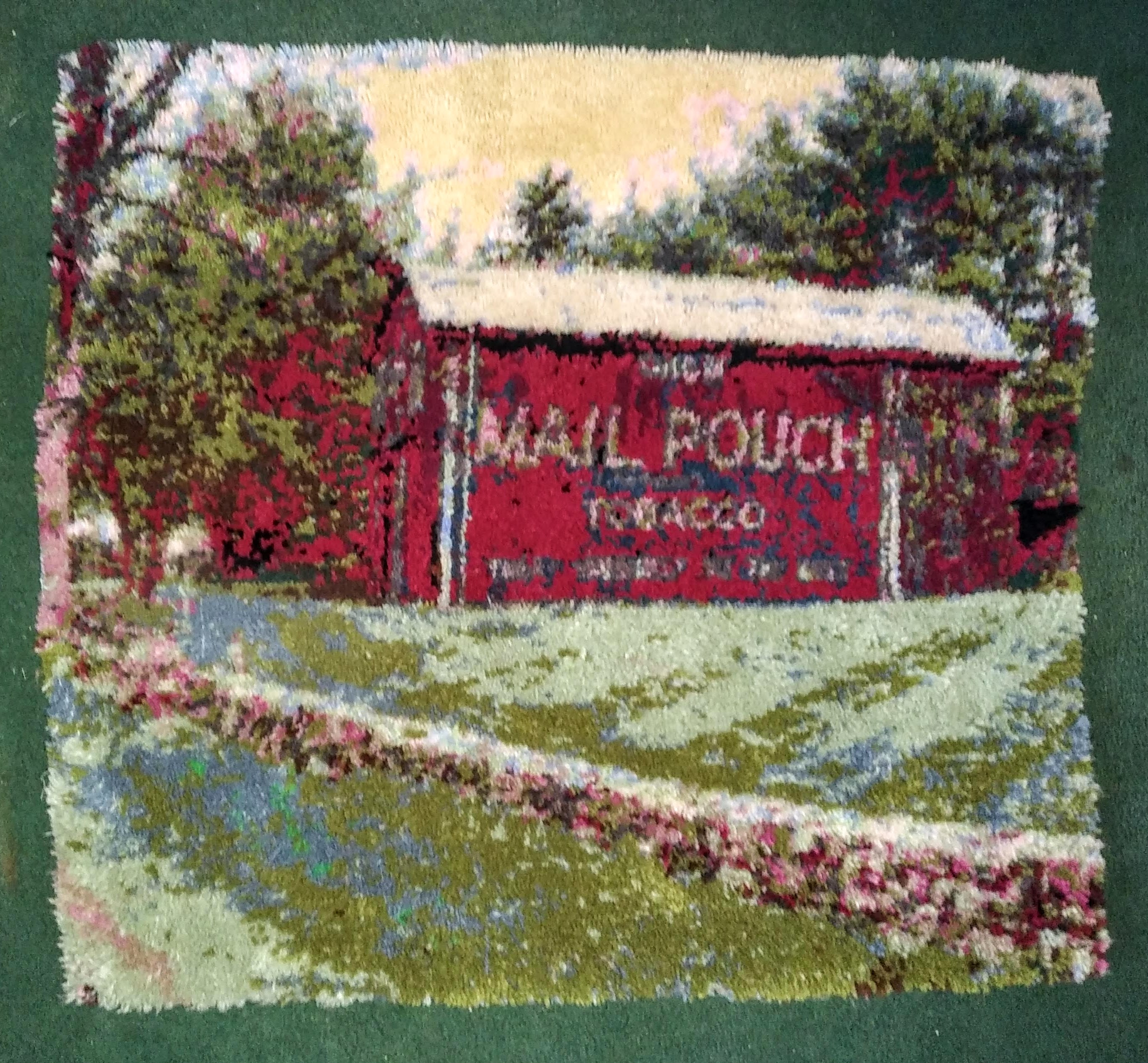 The rug measures 48″ x 53″ and features my reinterpretation of the Mail Pouch tobacco advertisement alongside a repurposed horse barn in Dutchess County.  The rug makes a great accent for any room (of course it does), and it’s one of a kind – which means you will be the ONLY person to own this little treasure.