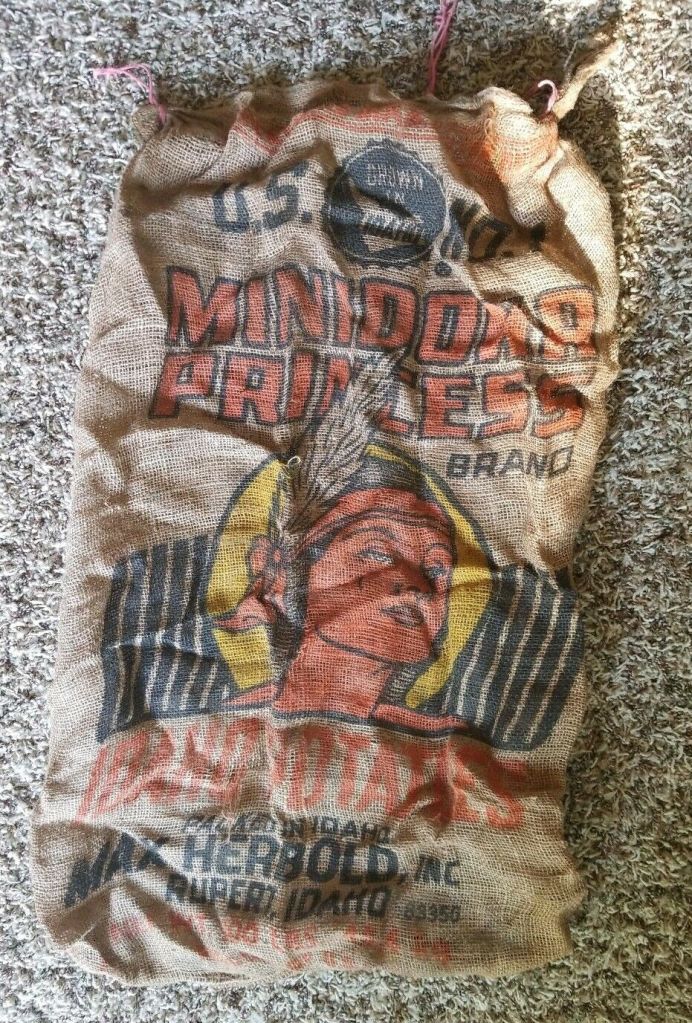 Jt’s a burlap sack, featuring a Native American maiden. It didn’t look like the typical potato sack Indian image, which was either a gruff-looking old Indian chief, or someone in a stereotypical war dance. Ugh.